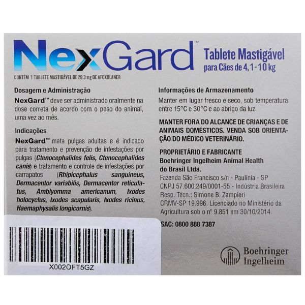 Por fim, após o uso, descarte corretamente a embalagem antipulgas Nexgard para cães com peso entre 4 e 10 kg. O medicamento contra pulgas Nexgard 28,3 mg tem efeitos colaterais? Sim. O fabricante indica que é possível, isoladamente, em alguns cães, reações que geram vômitos, pele seca/descamativa ou irritada, diarreia, letargia e anorexia. No entanto, não houve sintomas graves, os efeitos colaterais foram de curta duração e foram reduzidos com as doses subsequentes.